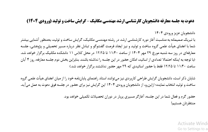 اطلاعیه دعوت به جلسه معارفه دانشجویان کارشناسی ارشد، گرایش ساخت ورودی 1404 و تولید