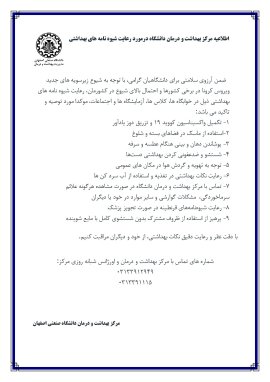 اطلاعیه مرکز بهداشت و درمان: شيوه نامههاي بهداشتي در دانشگاه اطلاعیه مرکز بهداشت و درمان: شيوه نامههاي بهداشتي در دانشگاه به پیوست می باشد.