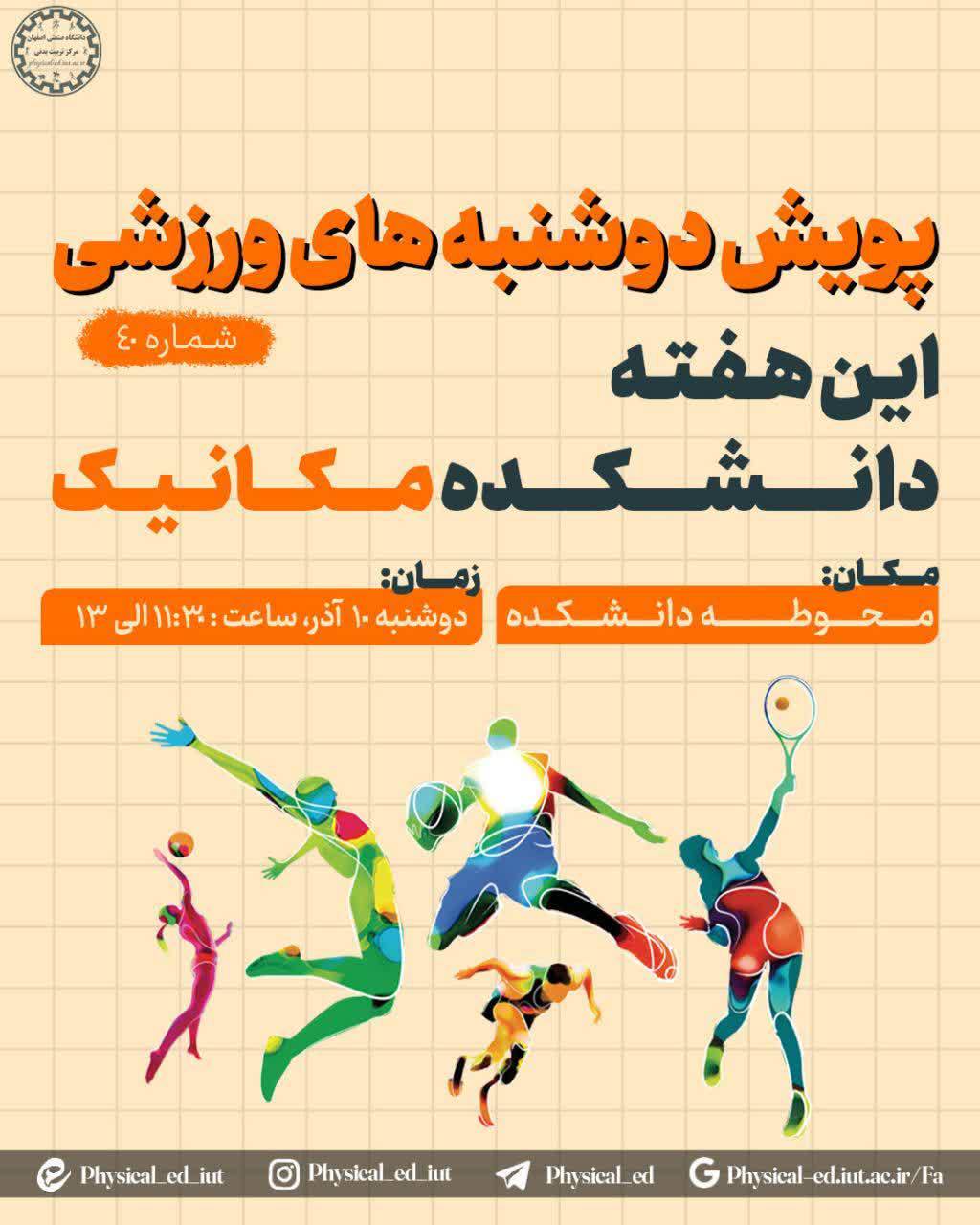 اطلاعیه پویش دوشنبه های ورزشی #پویش_دوشنبه_های_ورزشی این هفته دانشکده مکانیک زمان: دوشنبه ۱۰ آذرماه ساعت ۱۱:۳۰ مکان: محوطه دانشکده@physical_ed_iut