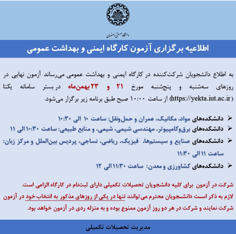 احتراماً به پيوست اطلاعيه مربوط به برگزاري آزمون كارگاه ايمني و بهداشت عمومي همراه با برنامه زمانبندي براي دانشكدههاي مختلف جهت استحضار ارسال ميشود. اين آزمون در روزهاي سهشنبه و پنجشنبه، 21 و 23 بهمنماه در سامانه يكتا طبق برنامه پيوست و از ساعت 10 صبح برگزار ميشود.