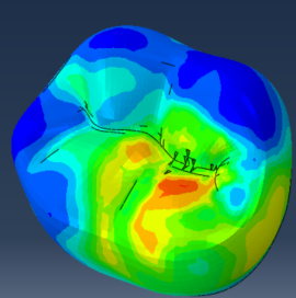 بیومکانیک دندانی برپایه تحلیلهای اجزا محدود (FE) اخیرا در دندانپزشکی، بیولوژیک، ریختشناسی و دیرینهشناسی دندان بهصورت گسترده باوجود کمبودهایی که در مدل کردن FE بخاطر شرایط بارگذاری غیرواقعی وجود دارد، مورد توجه قرارگرفتهاست. در این پروژه به بررسی و تحلیل دینامیکی اثر فشارهای متفاوت مانند: 50، 100، 150، و 200مگاپاسکال تحت سیکلهای جویدن متفاوت حرکت فک پایین به منظور جویدن غذا مثل: بارضربه، سینوسی و مثلثی، جابجایی و آثار تخریبی آنها که برروی دندان مولار پایین ایجاد میکنند در نرمافزار آباکوس، پرداخته و مقایسه میکنیم که کدام سیکل در فشار کمتری ترک میخورد و زودتر وارد فاز شکست میشود. طبق نتایج بدستآمده ابتدا بار ضربه و بعد از آن نزدیکترین سیکل به بار ضربه یعنی سیکل مثلثی و در انتها سیکل سینوسی به مرحلهی شکست میرسند. همچنین درمورد جابجایی لازم به ذکر است که جابجاییها در تمام سیکلها بسیار ناچیز بود.