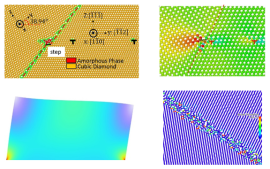 پرداخته شد. سپس به بررسی کمی و کیفی چگونگی شکل گیری نابجاییها، تنش شروع نابجایی ها، رشد و انتقال نابجایی ها از یک کریستال به کریستال مجاور، تعداد نابجاییها، سرعت نابجاییها، میزان پله ایجاد شده در مرز دانه در اثر شکل گیری اولین نابجایی، مقدار انرژی حالت پایداری سه ساختار مختلف دوکریستاله سیلیکون، مقدار انرژی تلف شده در اثر ایجاد نابجایی ها، پدیده بیشکل شدن و نهایتاً مساحت ناحیه بی شکل پرداخته شد و تغییرات هر یک از موارد فوق در دماهای کاری و تنشهای برشی اعمالی مختلف مورد مقایسه قرار گرفت. اضافه می گردد که بارگذاری ها شامل اعمال تنش برشی ضمن تغییر دمای کاری می باشند که در اثر اعمال تنش برشی و افزایش دما ایجاد شده است. شبیهسازی های انجام شده در دینامیک مولکولی در نرمافزارهای آووگادرو، ویامدی انجام و در اویتو نمایش داده شده است که ضمن ایجاد قابلیت های لازم جهت بررسی خواص ریزساختار ماده، دید بسیار خوبی از بعد گرافیکی نسبت به تغییرات ایجاد شده در ریز ساختار ماده ارائه می دهند و قابلیت اندازه گیری کمیت های مورد نظر را ایجاد می نمایند. پس از ثبت کمی و توصیف کیفی نتایج بدست آمده از شبیهسازی های دینامیک مولکولی، این نتایج برای استخراج ورودی های تحلیل میدان فاز مورد استفاده قرار گرفتند. هدف از تحلیل این داده ها در میدان فاز تعریف پارامترهای مختلف برای انرژی هلمهولتز سیستم و حل معادله گینزبرگ-لاندا بود که با استفاده از همین تحلیل، چگونگی پیدایش و رشد نابجایی ها تعیین می گردید. جهت تعریف پارامترهای مورد نیاز در رابطه انرژی آزاد هلمهولتز و معادله گینزبرگ-لاندا از نتایج به دست آمده از محاسبات دینامیک مولکولی استفاده گردید. به عبارت دیگر در بخش میدان فاز، کوپل مکانیک-میدان فاز با روش المان محدود و در نرمافزار کامسول مورد بررسی قرار گرفت. مقایس های بین نتایج مدل میدان فاز و نتایج ناشی از محاسبات دینامیک مولکولی صورت پذیرفت. تعداد نابجاییها و توزیع تنش در نمونههای شبیهسازی شده ارائه گردید و متعاقباً مدل فیزیکی قابل استفاده برای مدلسازی صفحات لغزش موازی ارائه گردید. در نهایت مشحص گردید که با افزایش دما و همچنین افزایش تنش برشی اعمالی بر المان شبیهسازی، سرعت نابجاییها، تعداد نابجایی، تنش نابجایی، تنش بیشینه در المان شبیهسازی همگی افزایش مییابند. این میزان افزایش در ساختار