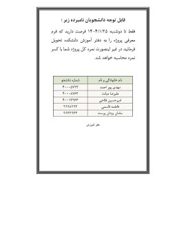 قابل توجه دانشجویان نامبرده (تحویل فرم معرفی پروژه تا تاریخ 1404/01/25)