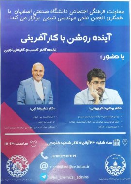 معاونت فرهنگی اجتماعی دانشگاه صنعتی اصفهان با همکاری انجمن علمی مهندسی شیمی برگزار می کند معاونت فرهنگی اجتماعی دانشگاه صنعتی اصفهان با همکاری انجمن علمی مهندسی شیمی برگزار می کند: آینده روشن با کارآفرینی