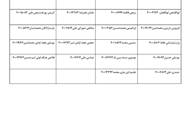قابل توجه دانشجویانی که اسامی آن ها آمده است. با توجه به اینکه ترم 4041 جزء سنوات مازاد می باشد در صورتی که ترم 4032 مشروط نمی باشید ملزم به اخذ 16 واحد در ترم جاری هستید.